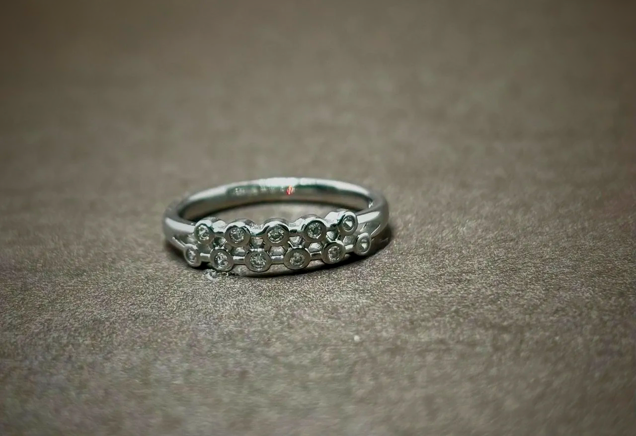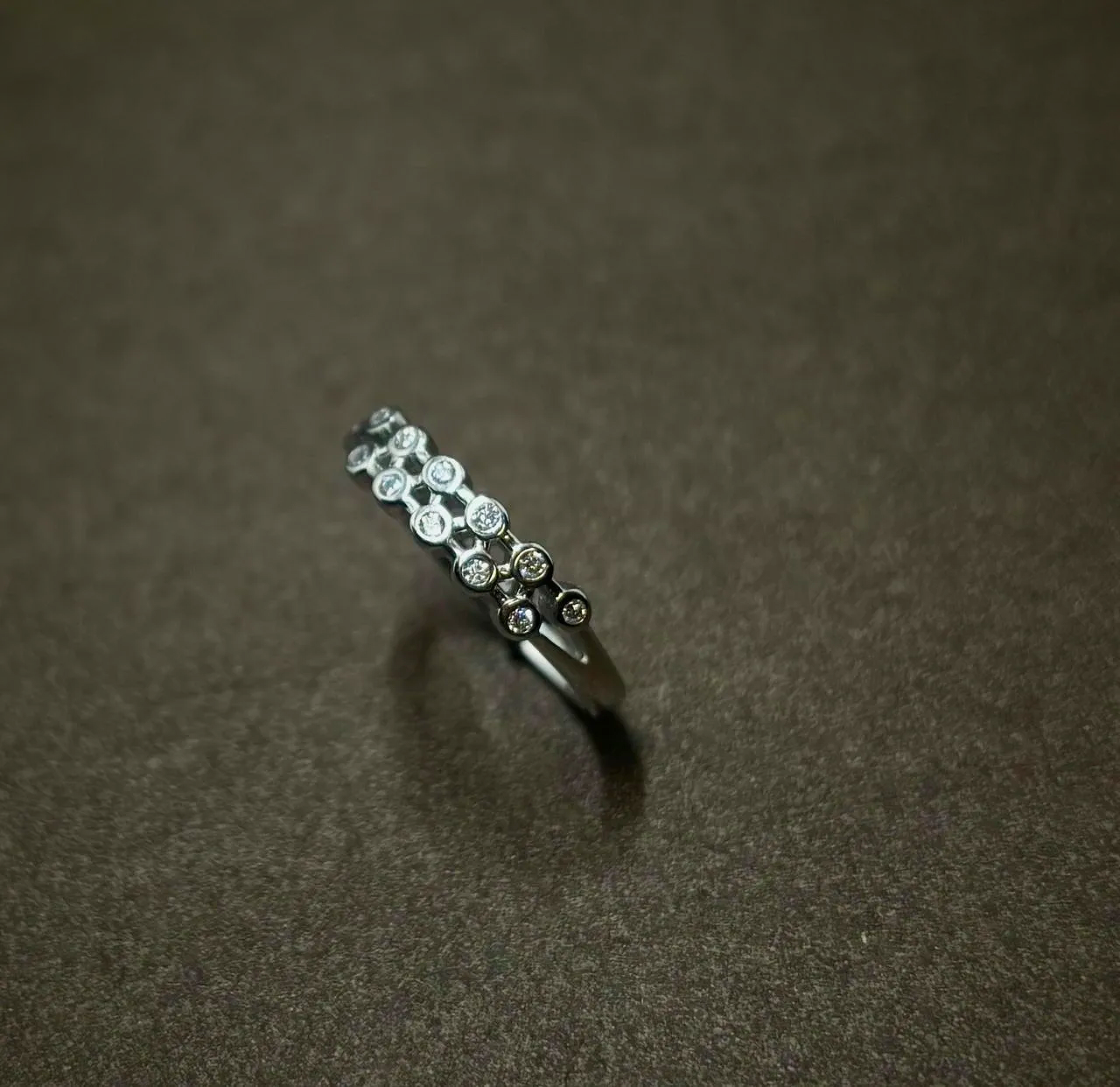 Elevate your jewelry collection with this exquisite stone cluster ring, designed to capture the essence of sophistication and timeless elegance. This stunning piece features a trio of delicately aligned rows, each adorned with shimmering round-cut stones that create a breathtaking cluster effect.