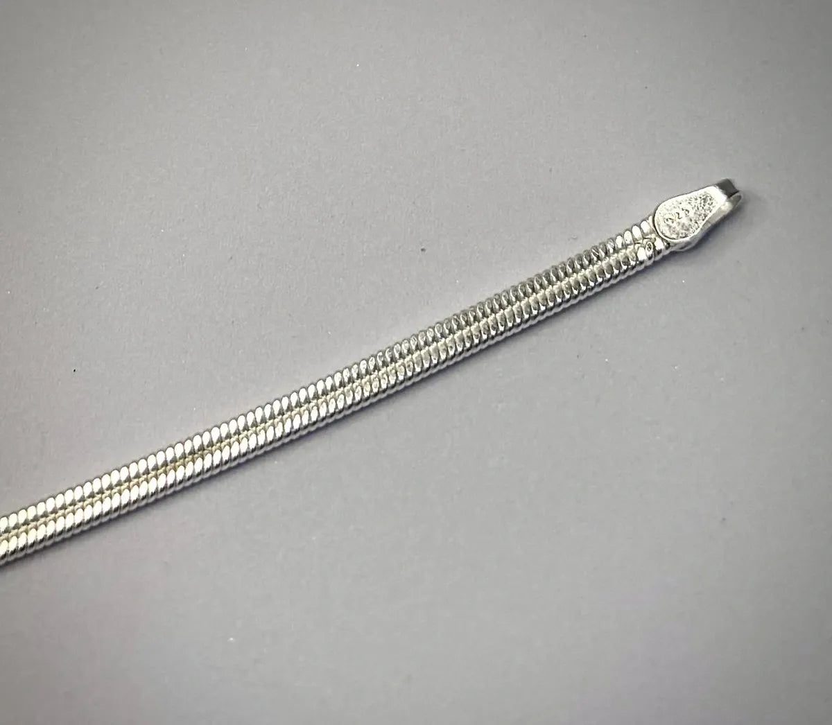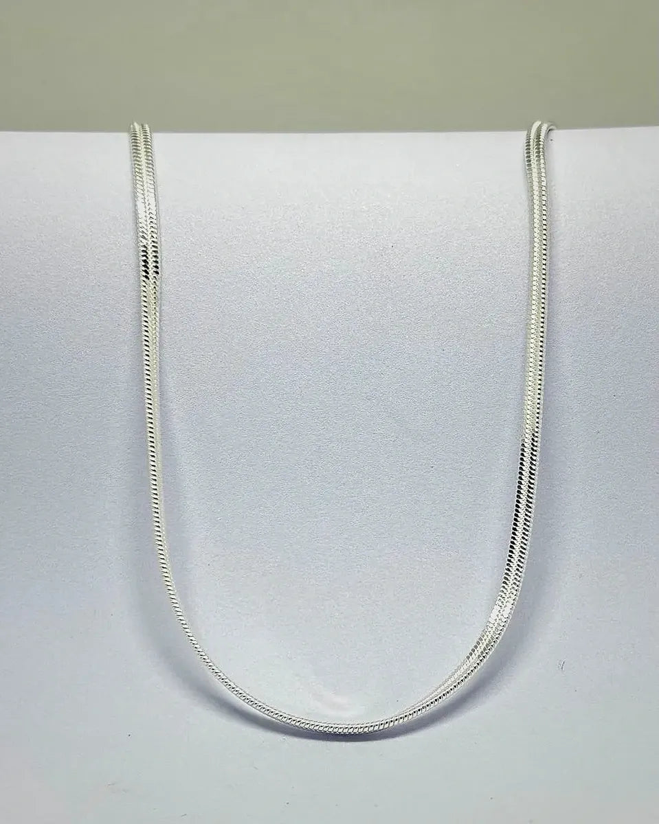 Drape yourself in the sleek luxury of our silver Herringbone chain. Its flat, fluid design offers a lustrous, mirror-like shine that catches every light, perfect for making a sophisticated statement on its own.