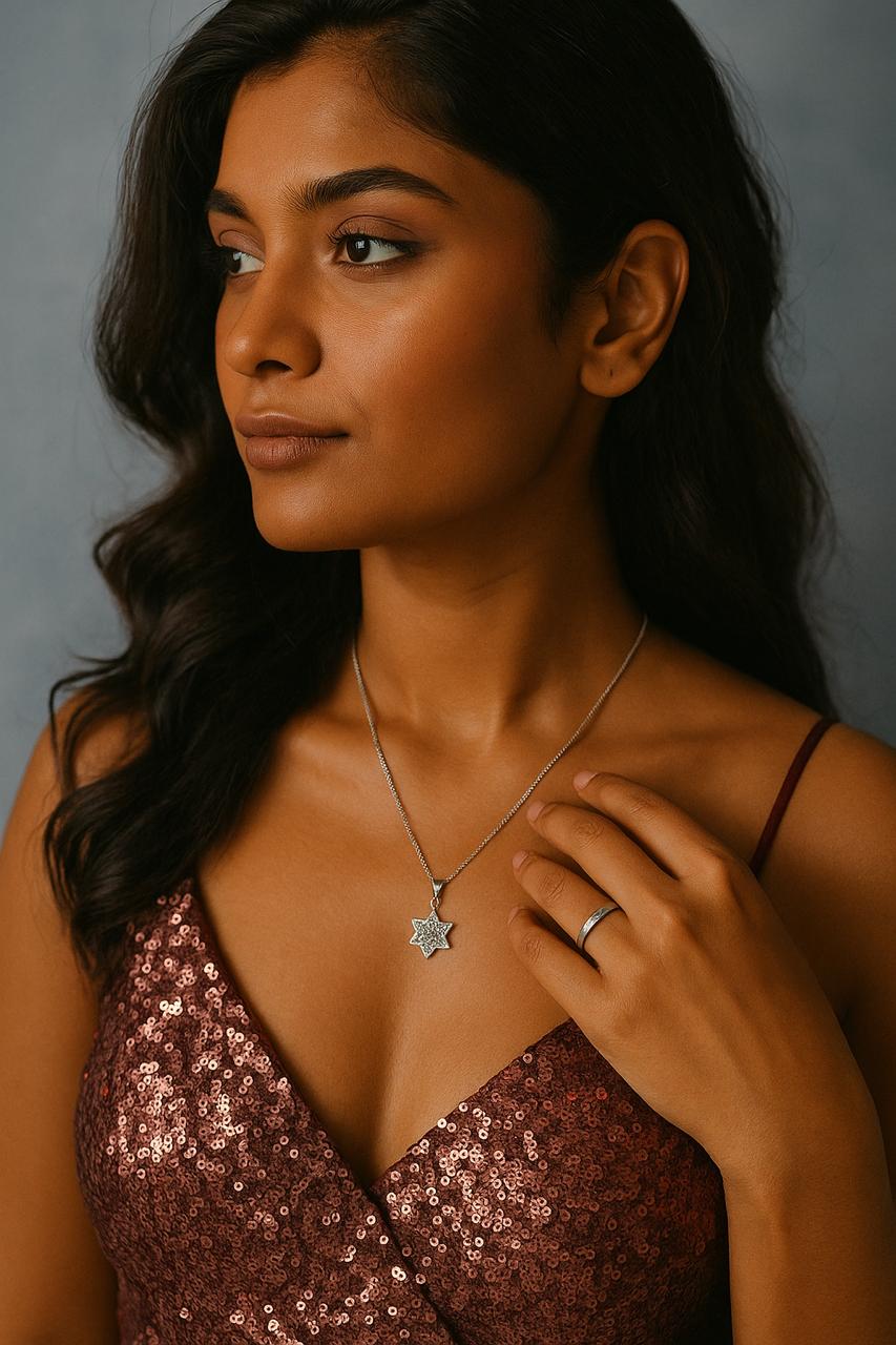 The Twinkling Star necklace is a stunning piece of jewelry featuring a Silver Star of David pendant embellished with sparkling crystals. Perfect for adding a touch of elegance.