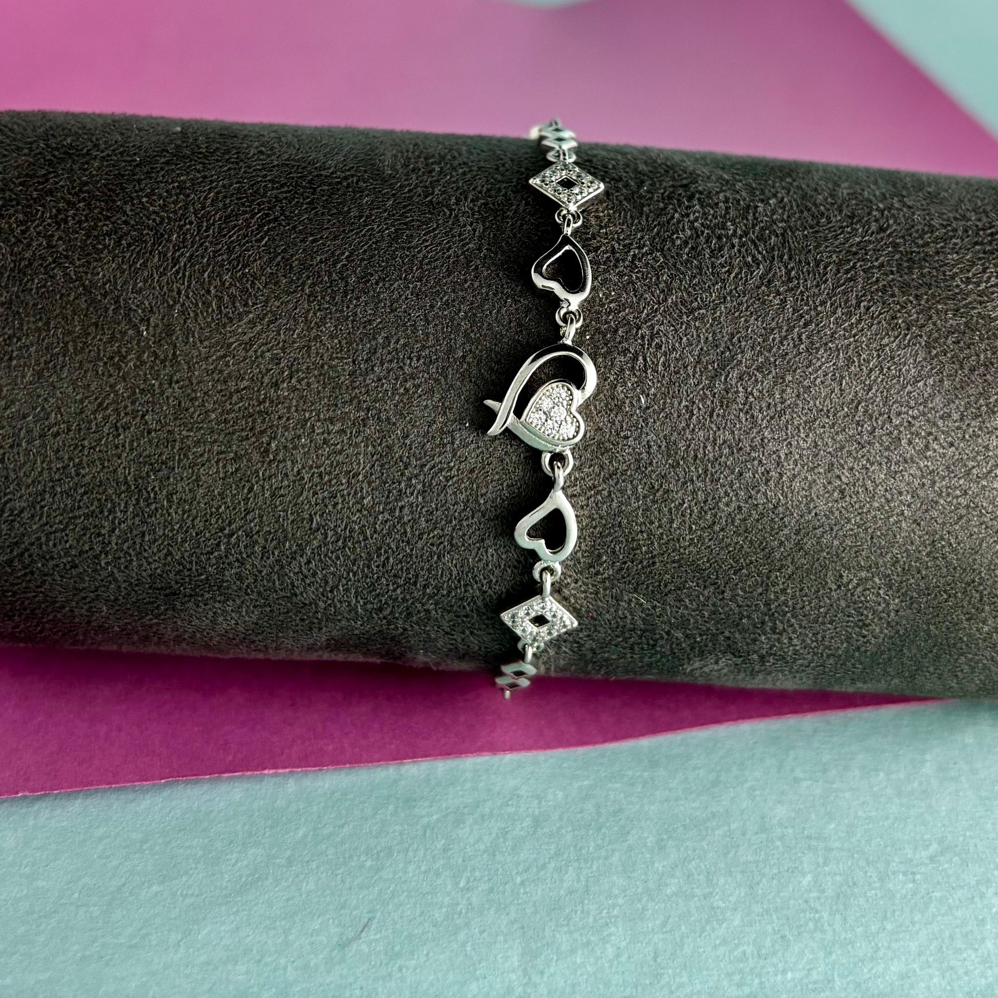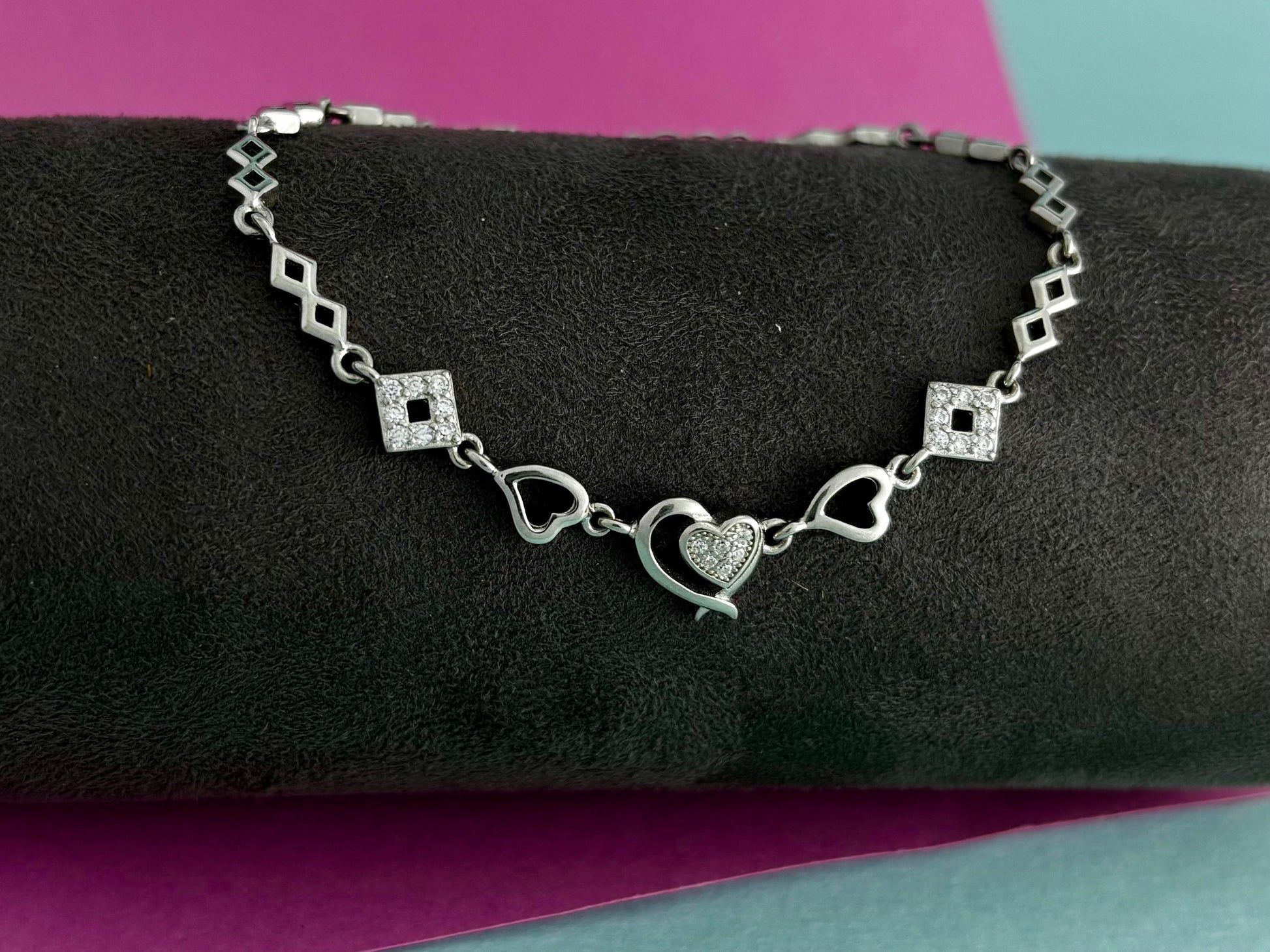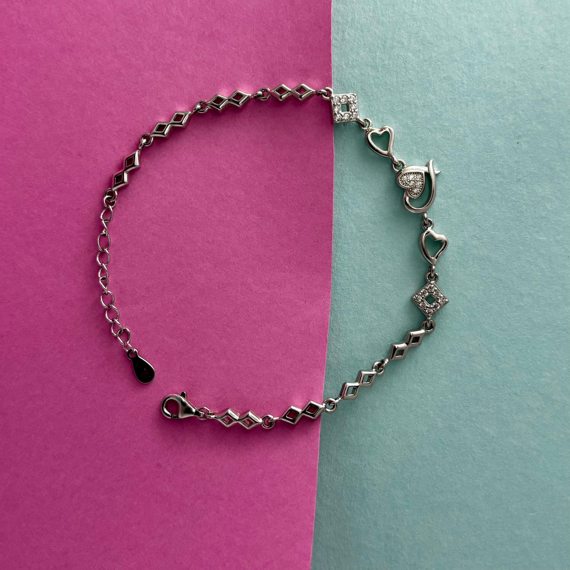 - Unique Mixed Motif Design: Features alternating open diamond/geometric shapes and delicate heart links.